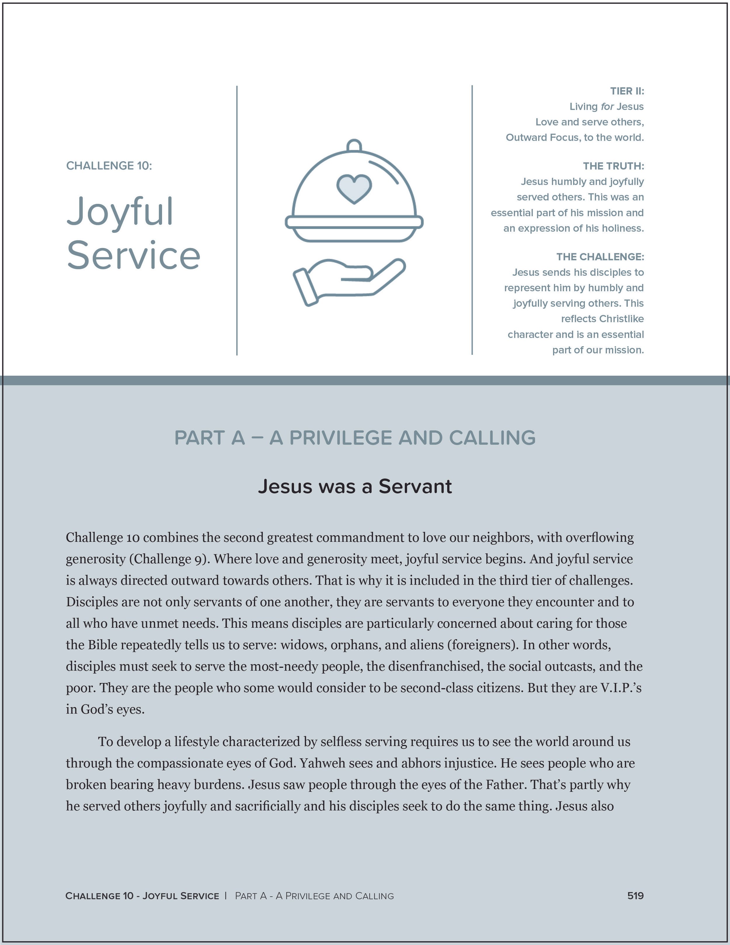 Challenge 10 combines the second greatest commandment to love our neighbors, with overflowing generosity (Challenge 9). Where love and generosity meet, joyful service begins. And joyful service is always directed outward towards others. That is why it is included in the third tier of challenges. Disciples are not only servants of one another, they are servants to everyone they encounter and to all who have unmet needs. This means disciples are particularly concerned about caring for those the Bible repeatedly tells us to serve: widows, orphans, and aliens (foreigners). In other words, disciples must seek to serve the most-needy people, the disenfranchised, the social outcasts, and the poor. They are the people who some would consider to be second-class citizens. But they are V.I.P.’s in God’s eyes.