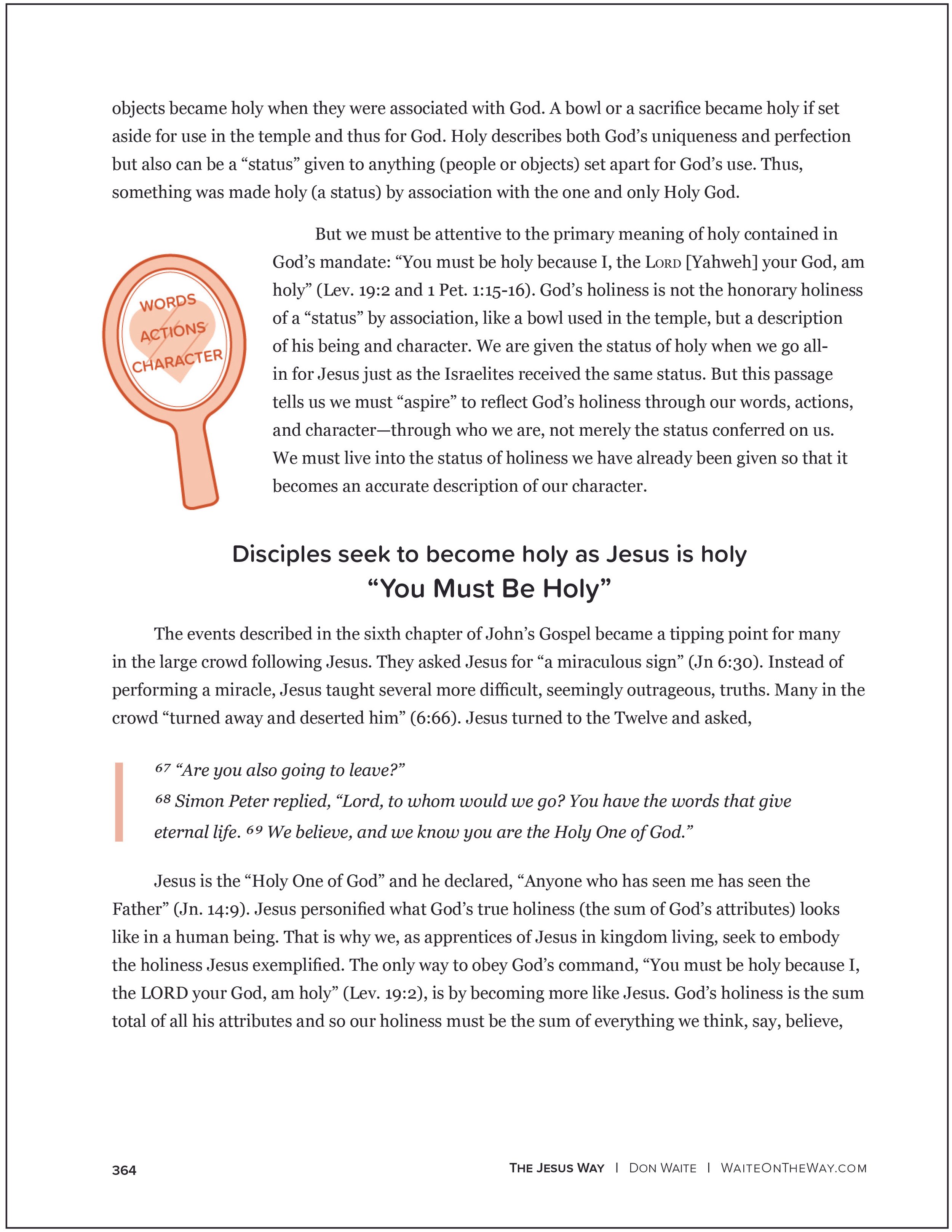 Holiness is also a prominent theme in each of the Tier II challenges (“Become Like Jesus: Character Transformation”) and a foundational concept that undergirded the OT system of covenant and laws. The God of the Bible, Yahweh, is first and foremost described as the holy God. He’s the meaning and ultimate standard of holiness. Consequently, his people must also be holy. “You must be holy because I, the LORD [Yahweh] your God, am holy” (Lev 19:2). The command to be holy, however, is more than just one of the 613 OT laws. Holiness is what makes each of the other laws life-giving and God-honoring. The apostolic teaching makes holiness a prominent theme in the Jesus Way (1 Pet 1:15-16). The Jesus Way is the way of holiness, because Jesus was the “Holy One of God” (Mk 1:24; Lu 1:35, 4:35; and Jn 6:69).