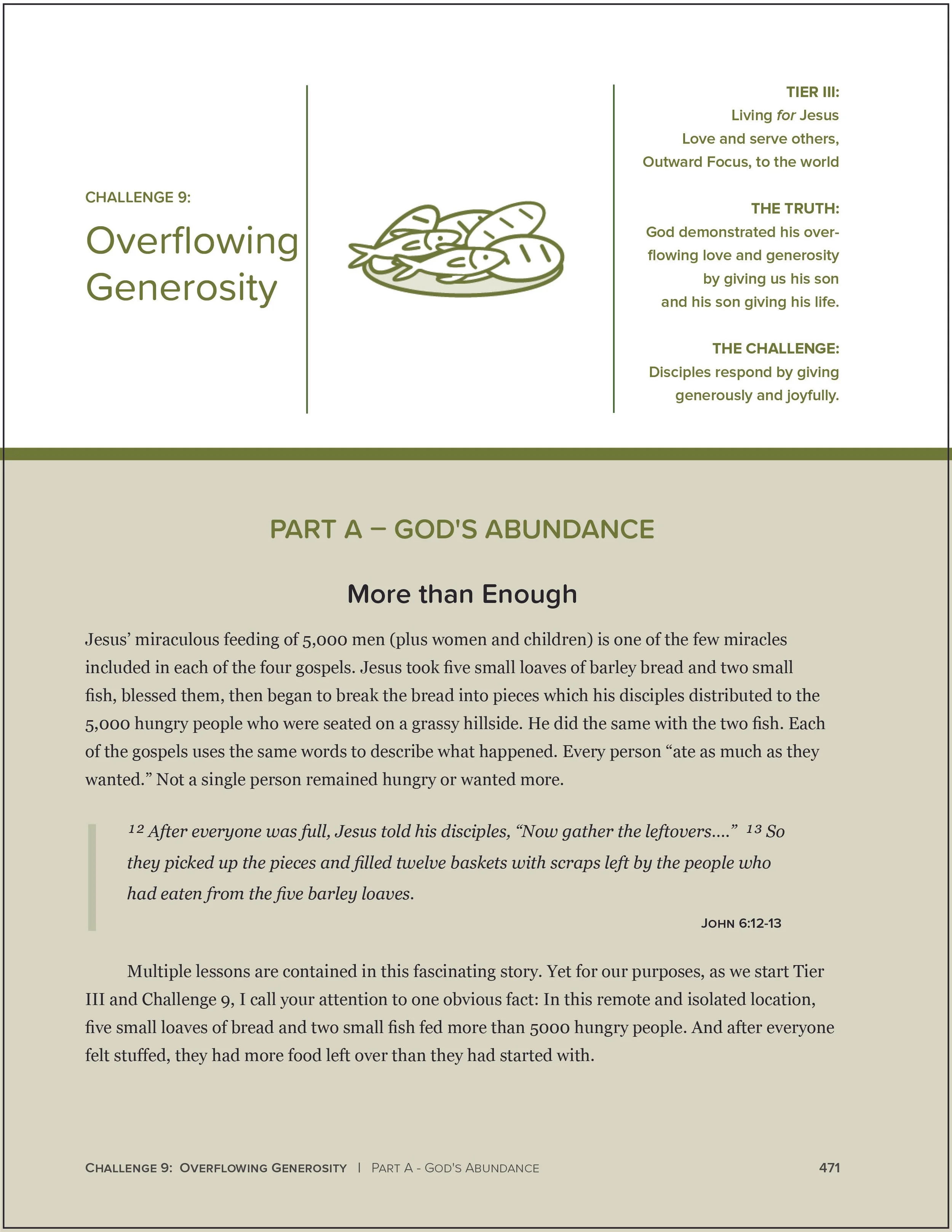 Multiple lessons are contained in this fascinating story. Yet for our purposes, as we start Tier III and Challenge 9, I call your attention to one obvious fact: In this remote and isolated location, five small loaves of bread and two small fish fed more than 5000 hungry people. And after everyone felt stuffed, they had more food left over than they had started with.