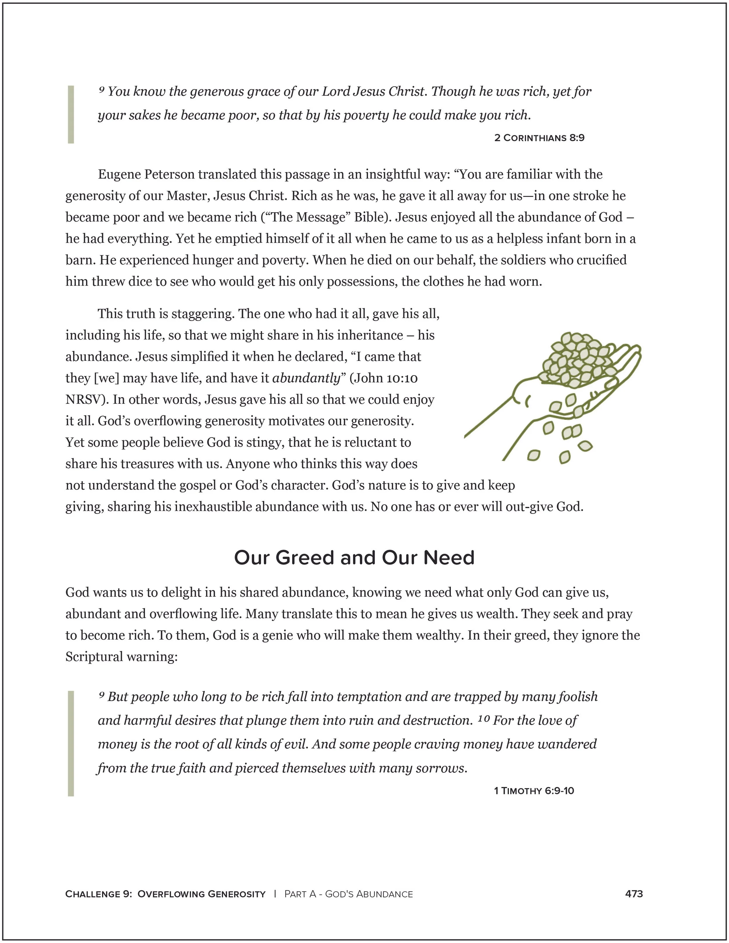 God is a God of abundance. That is the starting point for Step 9. But God is also a God of overflowing generosity. God loves to freely give life-enhancing gifts. By nature, God shares his abundance with us. The gospel both demonstrates and reveals God’s generosity. Challenge 9 declares that God gave us what was most precious to him—his Son—and his Son gave his life for us. God continues to give his best, his priceless gifts of life and love. We deserve his condemnation, but he gives us unconditional love, forgiveness, and grace. Paul describes his overflowing generosity with these words: