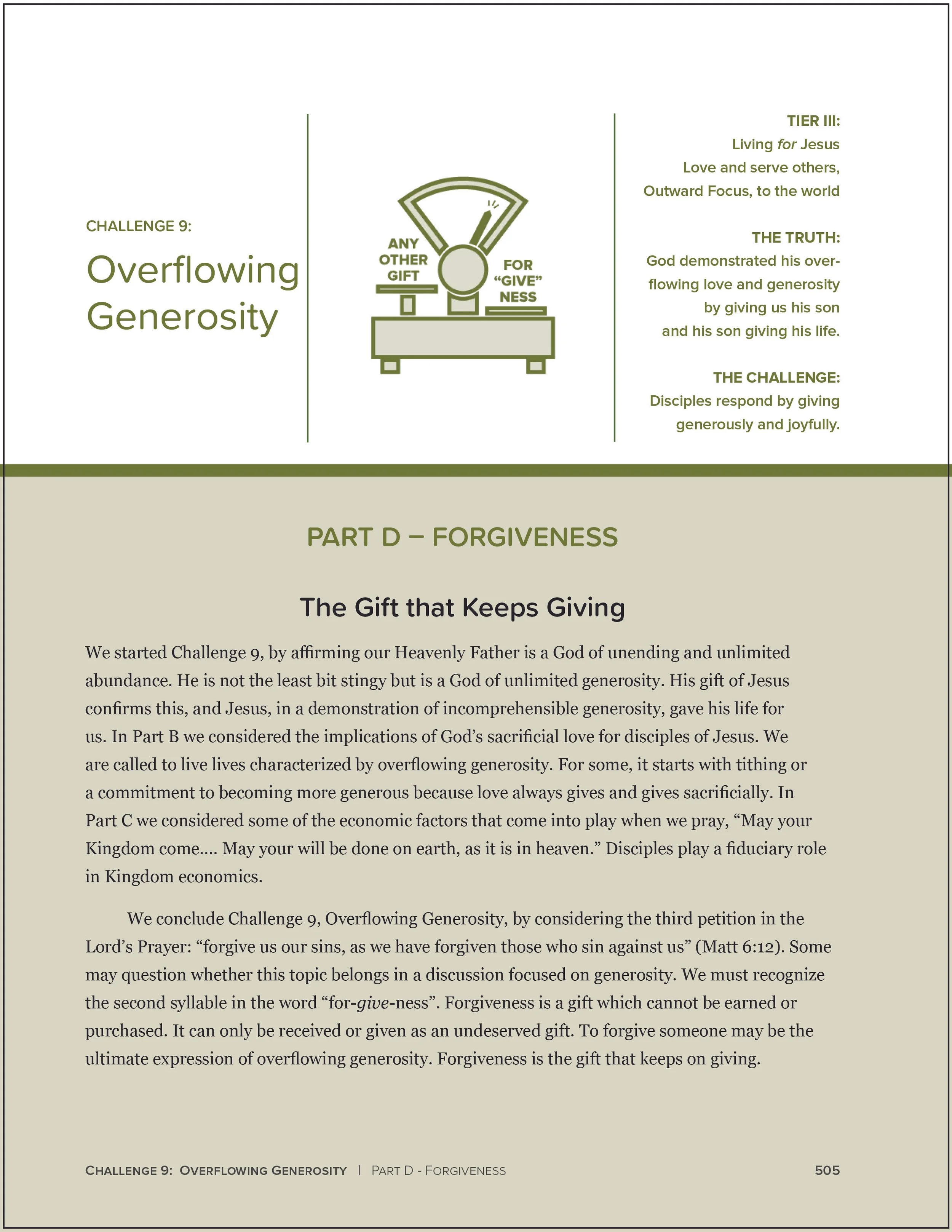 We conclude Challenge 9, Overflowing Generosity, by considering the third petition in the Lord’s Prayer: “forgive us our sins, as we have forgiven those who sin against us” (Matt 6:12). Some may question whether this topic belongs in a discussion focused on generosity. We must recognize the second syllable in the word “for-give-ness”. Forgiveness is a gift which cannot be earned or purchased. It can only be received or given as an undeserved gift. To forgive someone may be the ultimate expression of overflowing generosity. Forgiveness is the gift that keeps on giving.