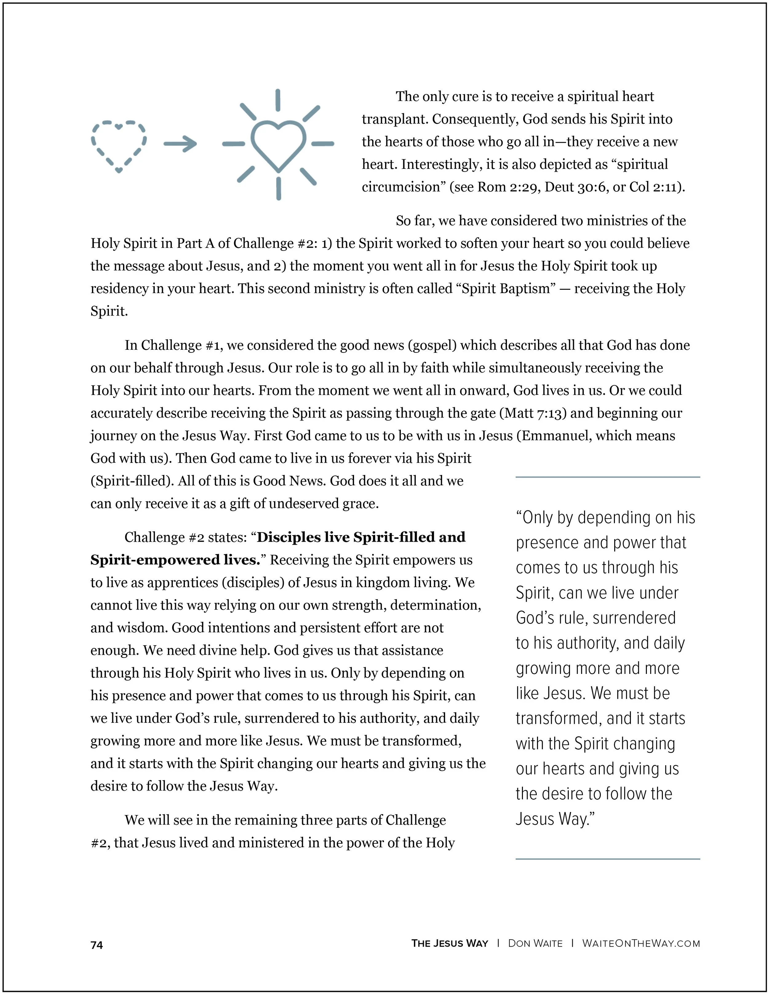 In Challenge 1, we considered the good news (gospel) which describes all that God has done on our behalf through Jesus. Our role is to go all in by faith while simultaneously receiving the Holy Spirit into our hearts. From the moment we went all in onward, God lives in us. Or we could accurately describe receiving the Spirit as passing through the narrow gate (Matt 7:13) and beginning our journey on the Jesus Way. First God came to us to be with us in Jesus (Emmanuel, which means God with us). Then God came to live in us forever via his Spirit (Spirit-filled). All of this is Good News. God does it all and we can only receive it as a gift of undeserved grace.