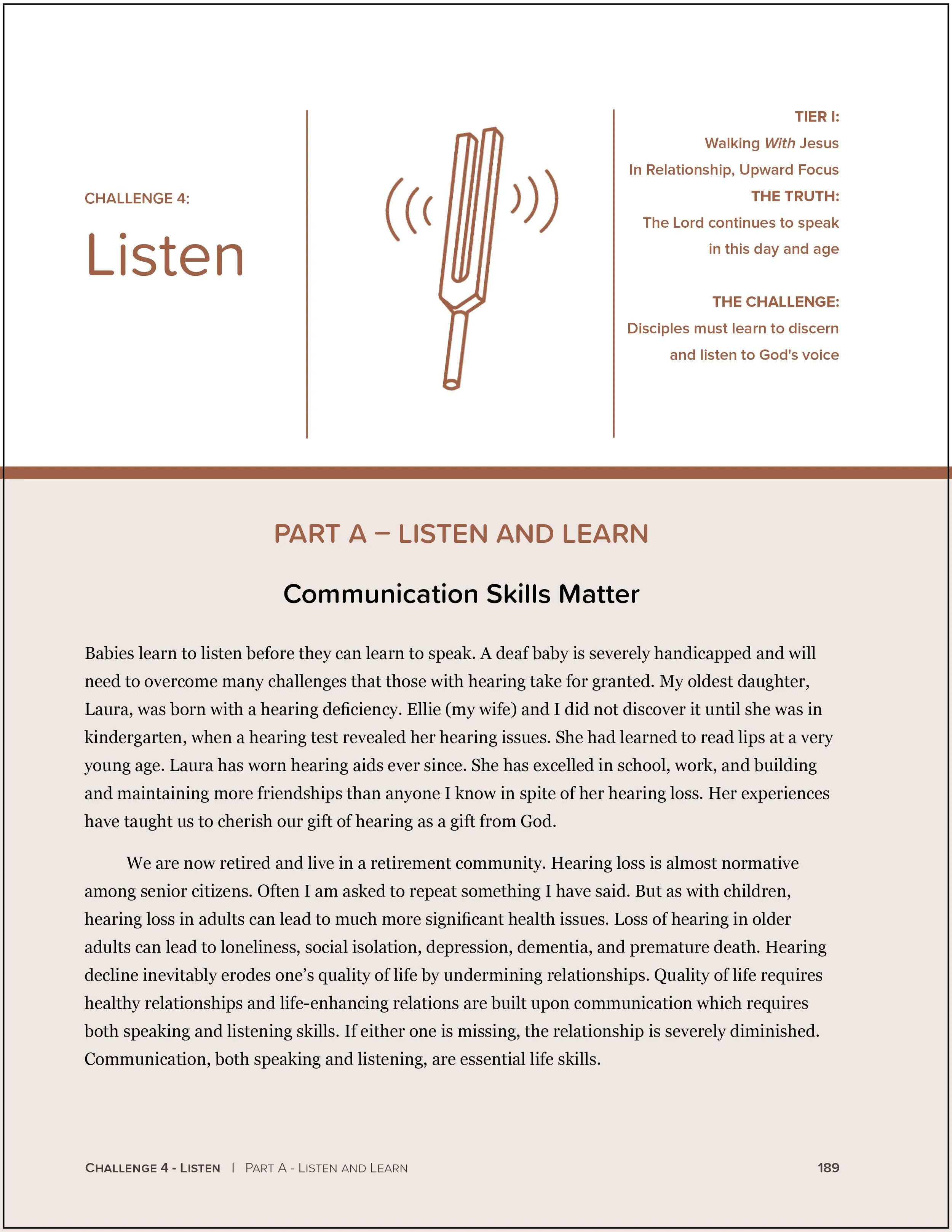 The third challenge described our natural response to God’s initiating love as giving thanks to God. Giving thanks to God is also relational. Without thankful hearts we will inevitably veer away from a relational approach to living as disciples and replace it with a more religious, dutiful approach, like the older brother in the story of the prodigal son. Part D of the third challenge indicated saying “thank you” to God, is both the simplest of prayers and the gateway to entering God’s presence. The fourth challenge focuses on “listening” to deepen our relationship with the Lord.191