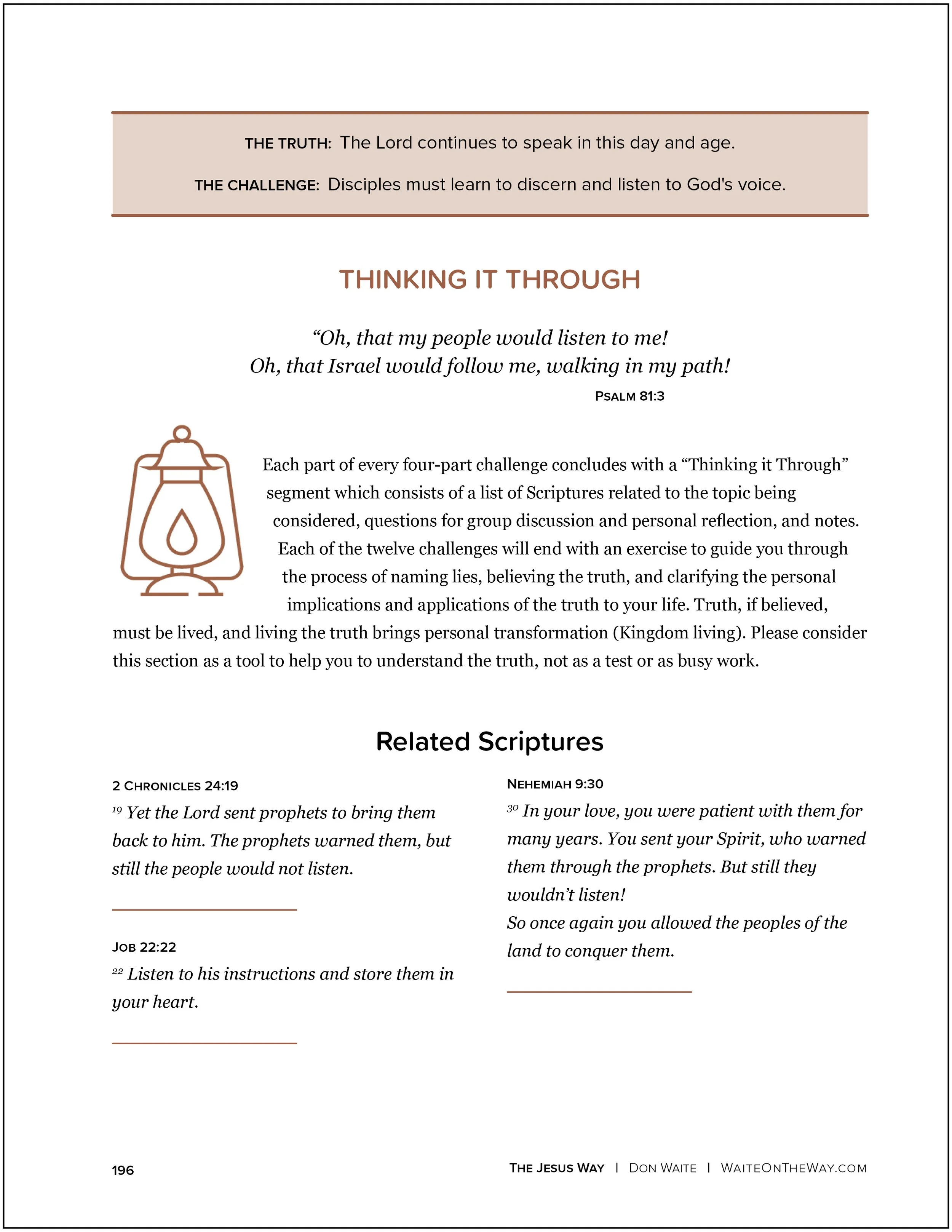 Each part of every four-part challenge concludes with a “Thinking it Through” segment which consists of a list of Scriptures related to the topic being considered, questions for group discussion and personal reflection, and notes. Each of the twelve challenges will end with an exercise to guide you through the process of naming lies, believing the truth, and clarifying the personal implications and applications of the truth to your life. Truth, if believed, must be lived, and living the truth brings personal transformation (Kingdom living). Please consider this section as a tool to help you to understand the truth, not as a test or as busy work.