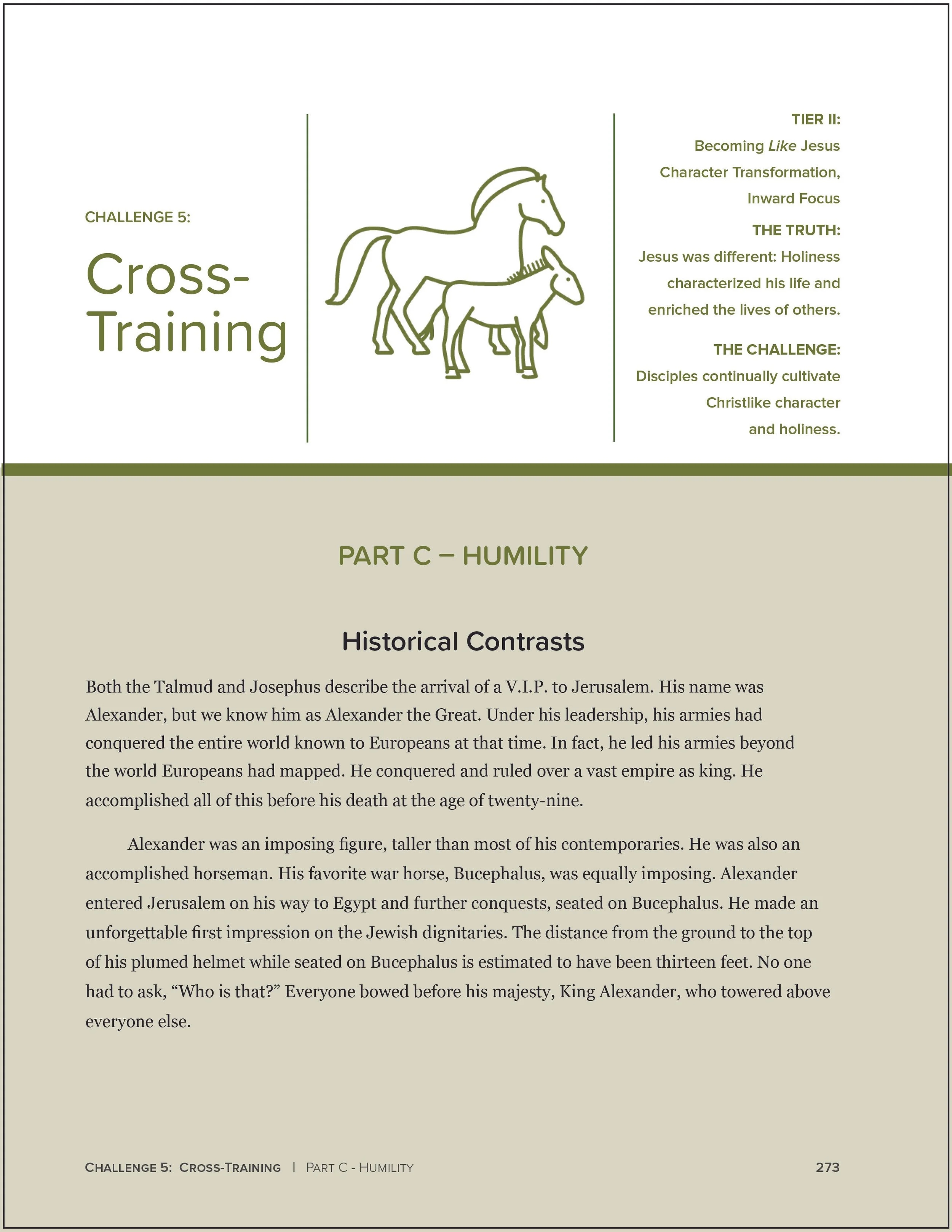The second tier of challenges, Cross Training, beginning with Challenge #5 (Broken), calls all disciples to become more like Jesus. Part “C” lifts up humility as an indispensable component in our cross training. But humility turns the ways of the world upside down. Life in the kingdom has radically different values. The radical nature of God’s Kingdom is rooted (radix) in humility before God and one another. Humility is not weakness, but an expression of strength exercised with self-restraint. Love, self-denial, healthy relationships, saving faith, and ultimately, sharing in the Lord’s glory, are eternally linked to humility. It permeates every part of Kingdom living. God prizes humility.