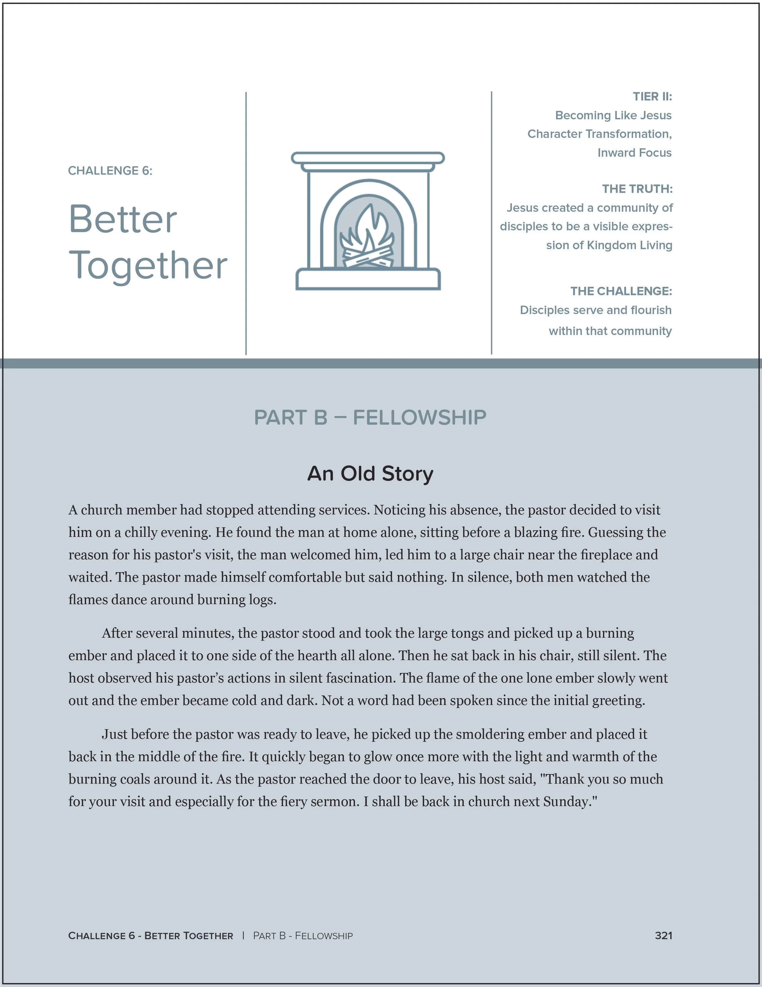 Just before the pastor was ready to leave, he picked up the smoldering ember and placed it back in the middle of the fire. It quickly began to glow once more with the light and warmth of the burning coals around it. As the pastor reached the door to leave, his host said, "Thank you so much for your visit and especially for the fiery sermon. I shall be back in church next Sunday."