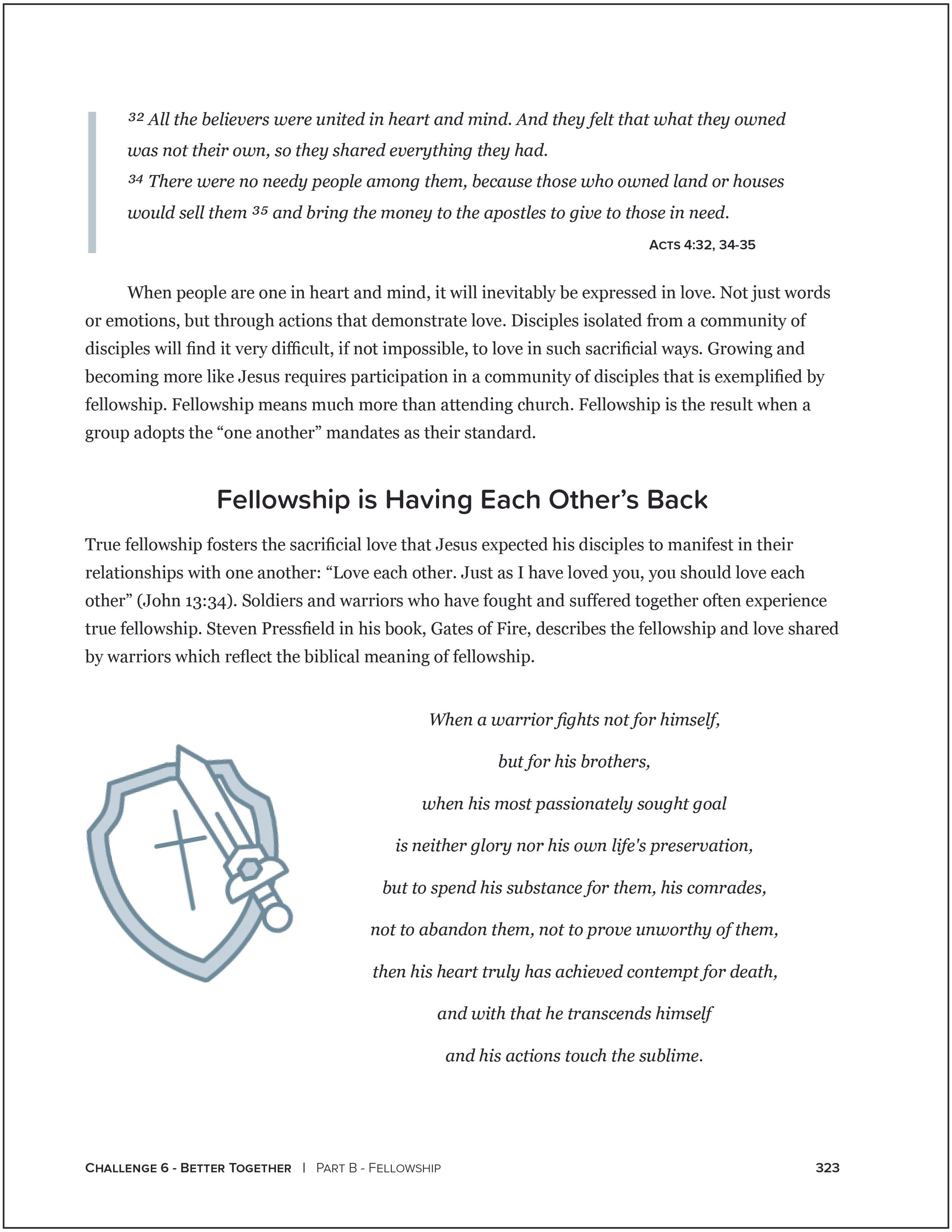 True fellowship fosters the sacrificial love that Jesus expected his disciples to manifest in their relationships with one another: “Love each other. Just as I have loved you, you should love each other” (John 13:34). Soldiers and warriors who have fought and suffered together often experience true fellowship. Steven Pressfield in his book, Gates of Fire, describes the fellowship and love shared by warriors which reflect the biblical meaning of fellowship.