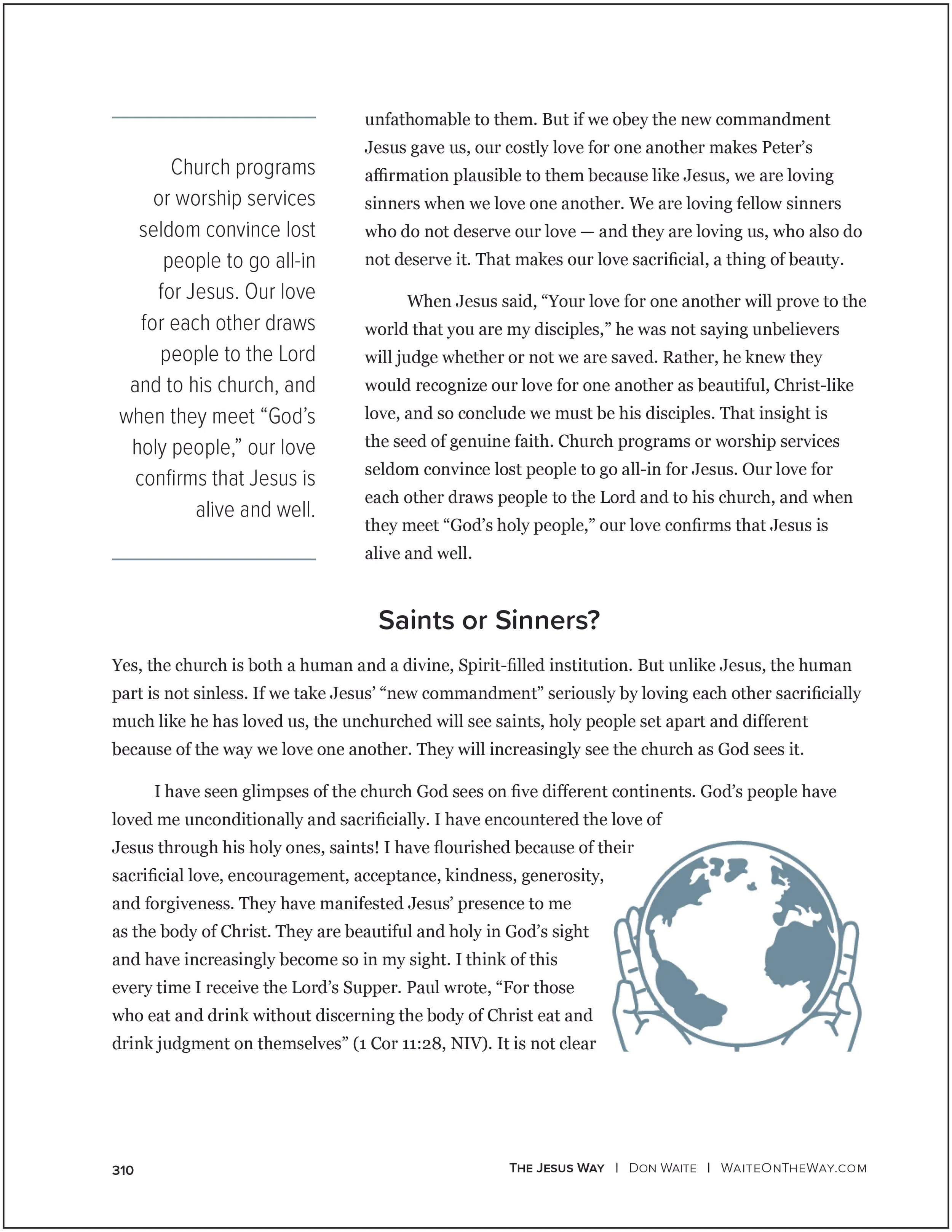 Yes, the church is both a human and a divine, Spirit-filled institution. But unlike Jesus, the human part is not sinless. If we take Jesus’ “new commandment” seriously by loving each other sacrificially much like he has loved us, the unchurched will see saints, holy people set apart and different because of the way we love one another. They will increasingly see the church as God sees it.